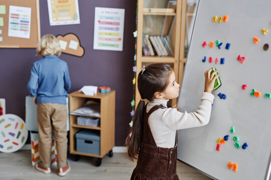 Clever learner of primary school cleaning whiteboard with plastic letters of English alphabet while compilating new words in classroom