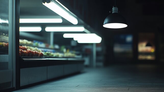 Dark, dimly lit grocery store aisle with produce display.