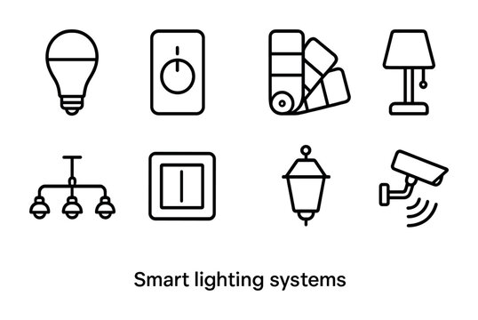 Smart Lighting Icons. Outline icon set of smart lighting systems: LED bulb, dimmer switch, color palette, lamp