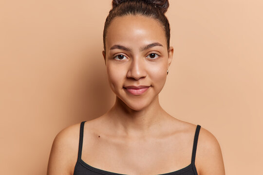 Portrait of healthy dark haired Latin woman with healthy clean skin has dimple on cheek dressed in casual t shirt isolated over brown background feels satisfied. Women and natural beauty concept