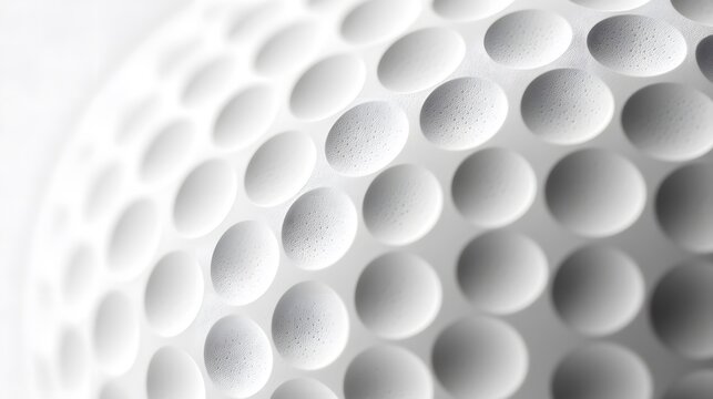 Extreme close-up of golf ball surface highlighting dimple pattern texture in cream white, featuring geometric patterns and soft focus in minimalist sports style.