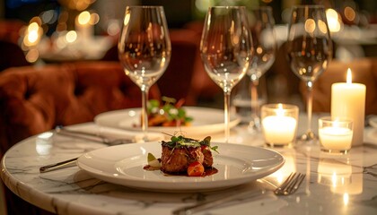Close-up of romantic dinner table in a fine dining setting, velvet chairs, marble table, artistic plating on dishes, ambient candlelight, creating a luxurious and intimate moodClose-up of romantic din
