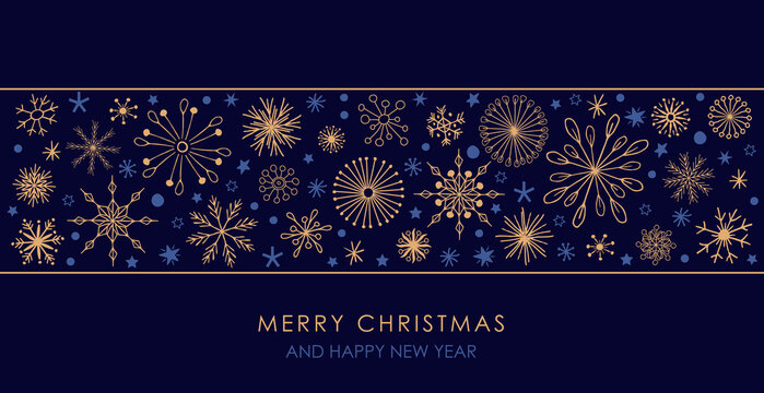 Merry Christmas greeting card elegant with fireworks, snowflakes and stars in gold and dark blue like night sky, printable in DIN lang and as banner for social media ads, web und internet