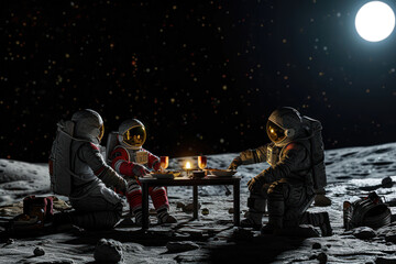 Explorers in spacesuits meeting diner on the moon