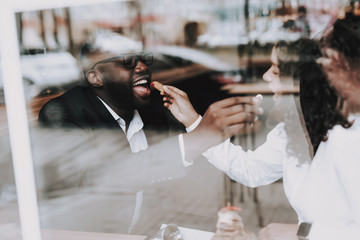 Guy and Girl Feeding. Black Man. Date . Cafe.