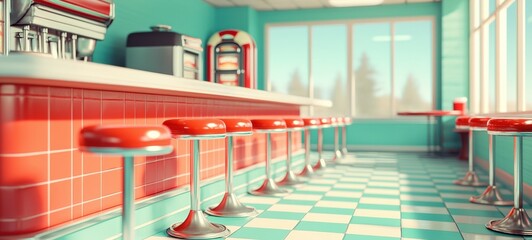 A photo of a vintage diner interior with retro jukebo