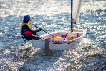 Boy sailing an optimist dinghy