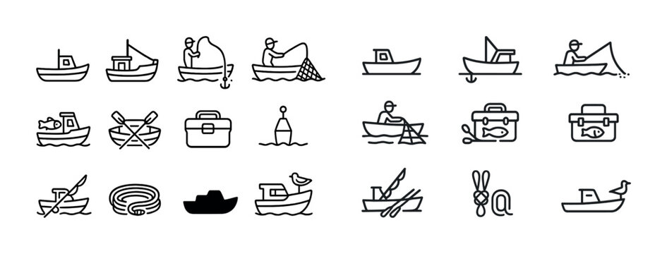 Collection of fishing icons: boats, fishermen, and equipment in various styles