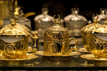 Traditional Arabic tea set with intricate golden designs and crescent moon finials. A luxurious showcase of Middle Eastern craftsmanship, perfect for tea rituals or elegant décor.