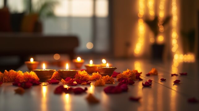 A cozy minimalist dining setup with glowing diyas, marigold garlands, and rose petals for Diwali celebrations in a light-filled home