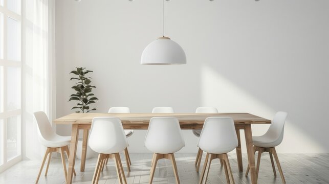 A minimalist dining area with a plain wooden table, white chairs, and a single pendant light