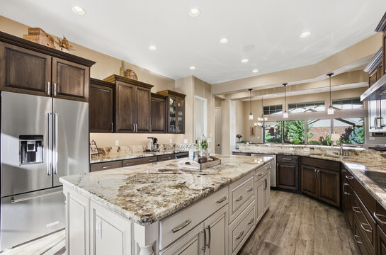 Empty modern apartment interior with panoramic windows and kitchen island. Real estate listing content