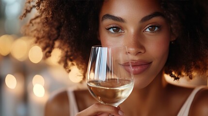 woman sipping wine at a fine dining restaurant, candlelight glow, refined atmosphere