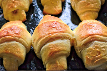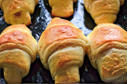 Shiny golden brown bread rolls in baking tin