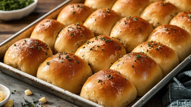 A tray of soft and pillowy dinner rolls, brushed with melted butter and sprinkled with garlic and herbs, perfect for serving alongside a meal.