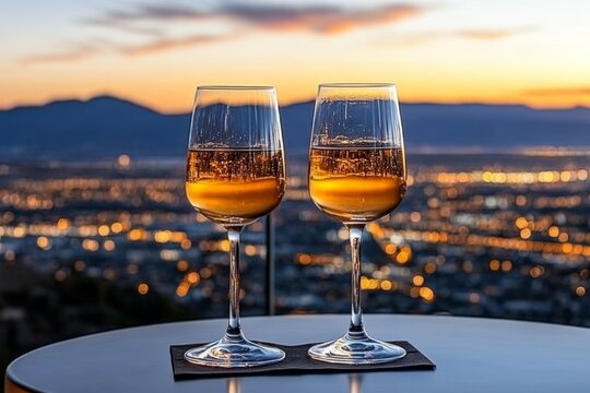 Romantic rooftop dinner with city lights below, showing a couple toasting with glasses, symbolizing elegance and shared dreams, symbolizing sophistication and closeness