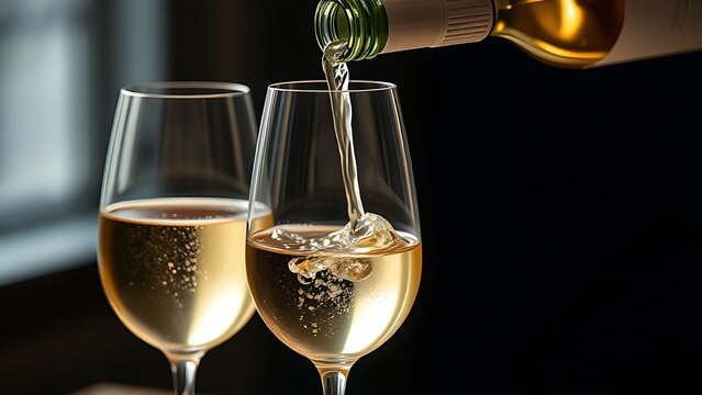 Two glasses of white wine being elegantly poured, capturing a moment of sophistication and relaxation.
