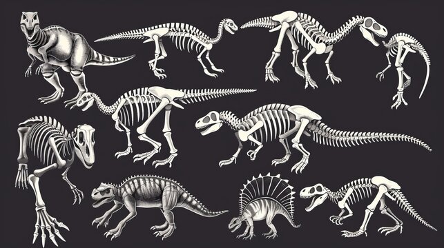 Fossil dinosaur silhouette. Dino skull with teeth. Bone skeleton print graphic. Dead ancient predator. Dinosaur Diplodocus Velociraptor Stegosaurus Triceratops Allosaurus Parasaurolophus Tyrannosaurus