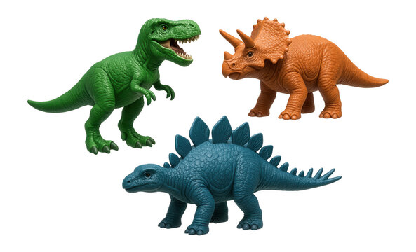 A set of miniature plastic dinosaur figurines for a child's bedroom shelf.