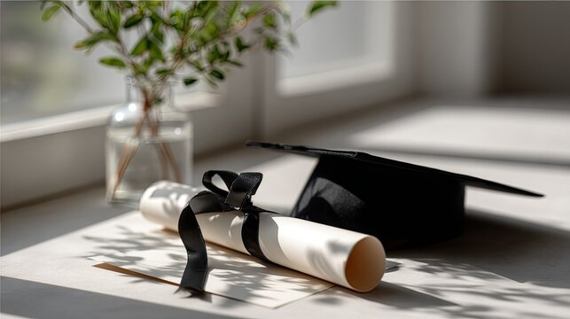 The graduation cap is placed on top of the diploma tied with a gold ribbon, symbolizing academic achievement. The background features a blurred bokeh effect, indicating celebration.