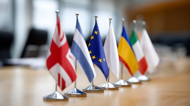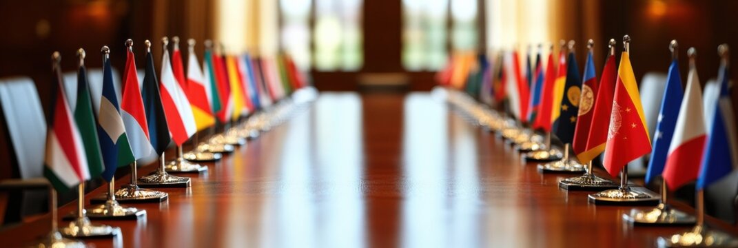 Mini flags representing multiple countries arranged on a negotiation table for international discussions and diplomatic efforts