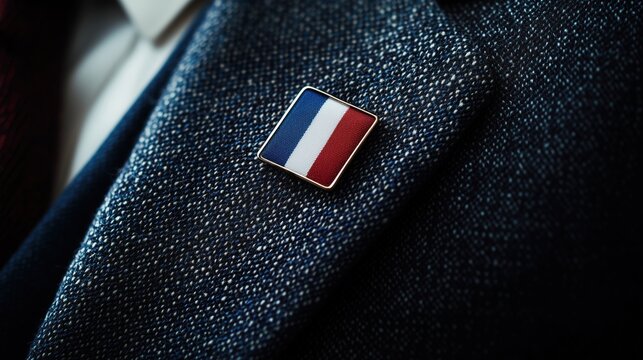 A close—up icon depicting the French tricolor — blue, white and red - is attached to the lapel of the jacket, symbolizing patriotism, diplomatic status or cultural identity of France.
