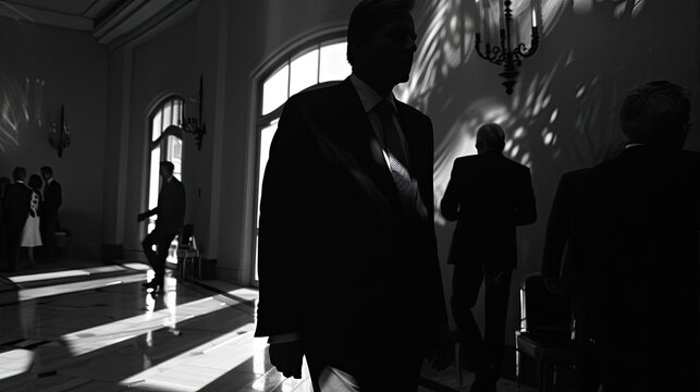 A shadowy figure gathering intelligence at a diplomatic event. Silhouette, many people, secret agent, secret organization. The concept of secret agents and spies in their tracks. Generative by AI