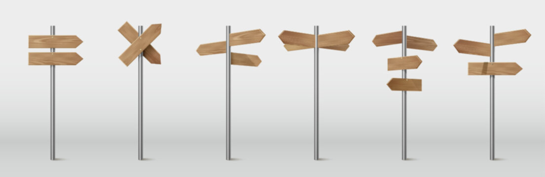 Direction sign post with arrow set.   Choice signpost to choose road or street, blank signboard pointer with wooden pole template. Sign board. Flat business style. Vector illustration.