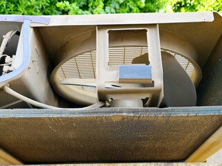 Dirty dusty condenser coil and the internal components of the outdoor air conditioning condenser unit, that undergoing routine cleaning and maintenance , the external unit being serviced