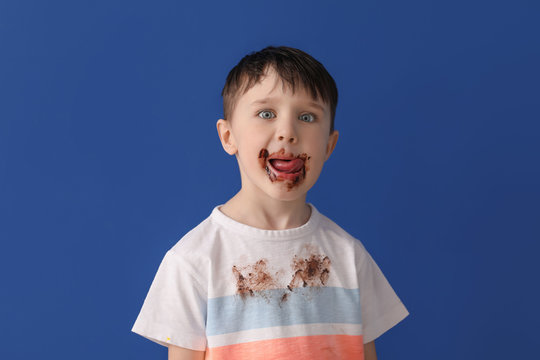 Closeup view of funny dirty mouth of kid after eating chocolate melted paste with spoon. Brown lips and teeth. Child licking spoon. Real time full hd video footage.