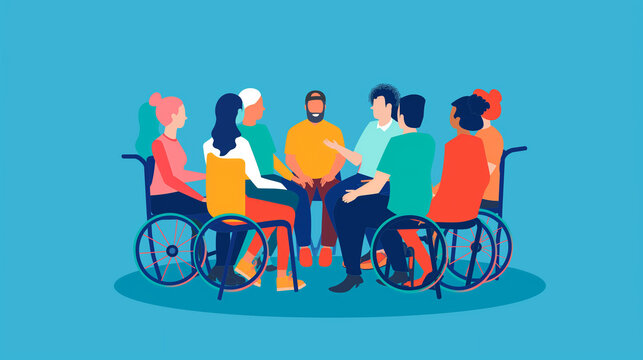A flat design of a person with a disability leading a group discussion, Disability Pride Month, flat design, with copy space