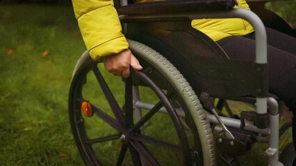 Caucasian disabled elderly woman sitting in wheelchair outdoors in park. Healthy strong medical concept. High quality FullHD footage