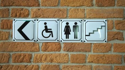 Signboard handicap toilet sign, toilet for people with disabilities. Female and male symbols on plates for public toilets, water closets. Sign. pointer. toilet or WC.