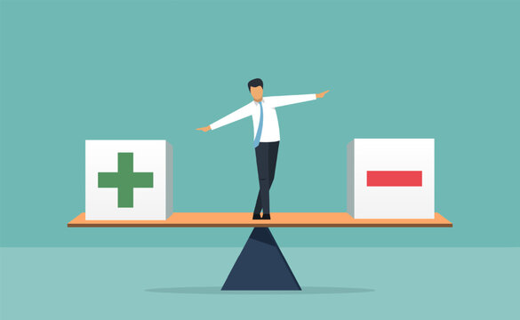 Pros and cons equilibrium in decision making under uncertainty, Plus and minus or positive and negative sign on blocks are in balance, businessman standing on seesaw with PLUS and MINUS symbol