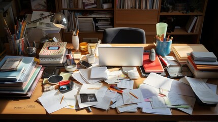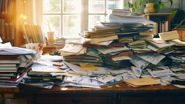 Cluttered Desk Chaos Stacks of Papers, Documents, and Files Bathed in Sunlight Create Cozy Yet Busy Workspace Atmosphere