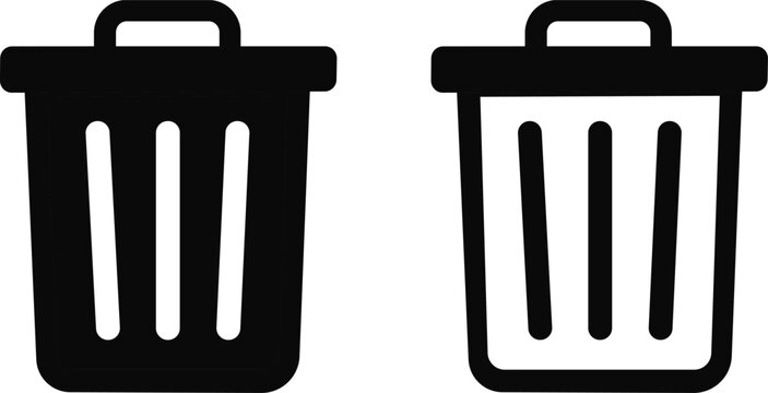 Black trash can icons, solid and outline styles, concept delete or discard functions