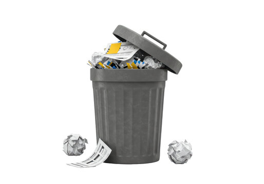 Isolated gray trash can overflowing with crumpled paper, discarded documents and lid up.