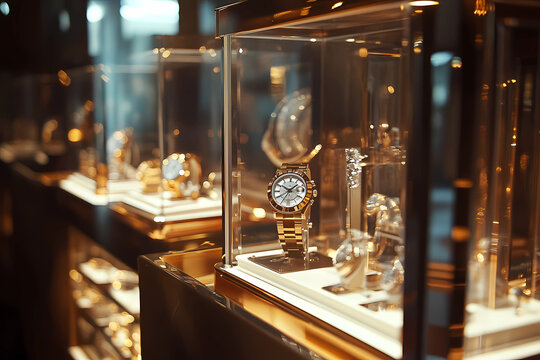 Opulent watch boutique showcasing luxurious displays and refined lighting to captivate discerning timepiece enthusiasts worldwide