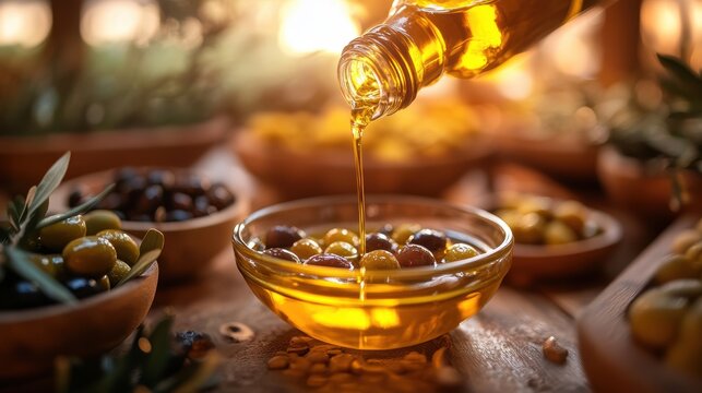 A golden liquid, rich and aromatic, the essence of Mediterranean sunshine, olive oil, bottled for the discerning palate, ready to elevate culinary experiences.