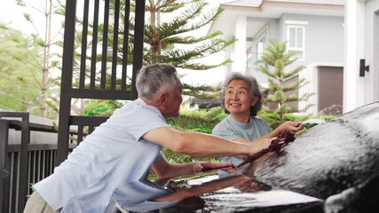 Asian Senior man washing his car outdoors, focusing on daily activity and independence.