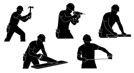 Construction Worker Silhouette Vector Showing Tool Actions — Hammering, Drilling, Sawing, Measuring