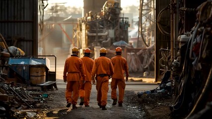 Industrial workers in orange protective uniforms walking through heavy manufacturing facility with machinery steel structures and active production