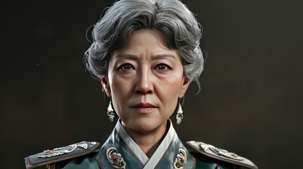 Middle-aged Hispanic female soldier with determined expression wearing tactical military vest against a neutral background