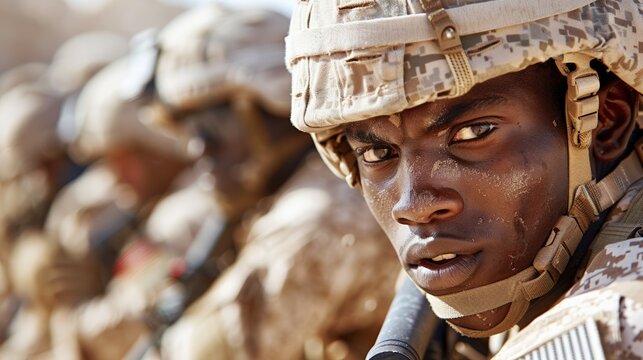 African male soldier in military gear focused during desert training exercise