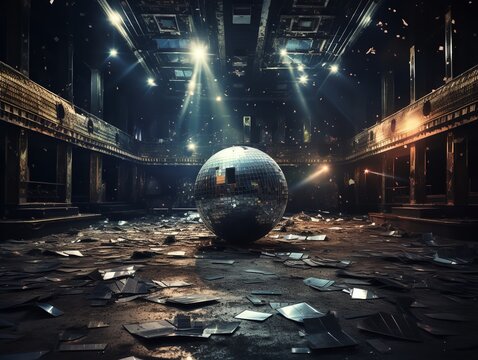 The sparkling disco ball casts fragmented shadows on the ground, a symbol of shattered dreams in the dark of night