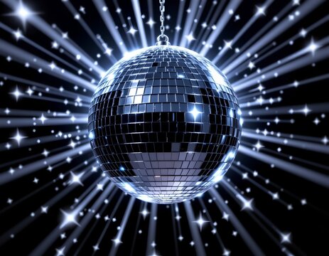 Spinning disco ball casting light rays across the dance floor atmosphere