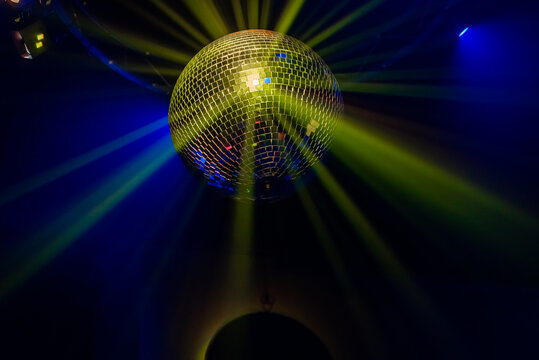 Disco party poster. Dance and music night party flyer with 80s disco ball and light effects. Vector illustration invite on glamour celebration with mirror sphere banner