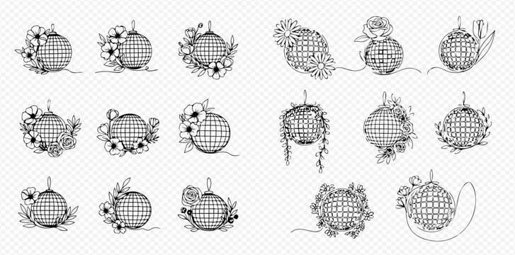 Set of elegant line art illustrations featuring disco balls adorned with various floral and botanical elements, perfect for decorative designs.