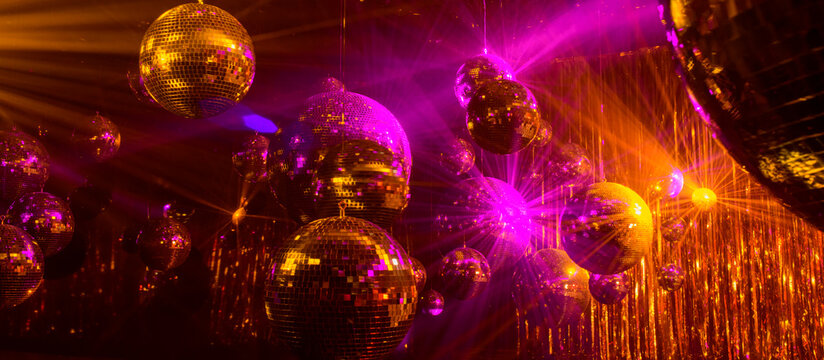 Shiny disco ball reflecting colorful lights, creating a party atmosphere with glowing bokeh effects.