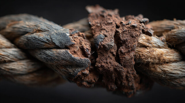 A close up of a worn rope with brown and black discoloration and frayed texture details